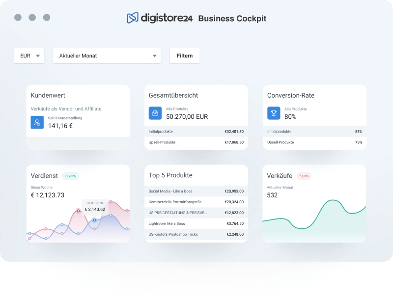 Grow your business by identifying trends through real time data in the Business Cockpit and getting applicable insights in Digistore24 Analytics.